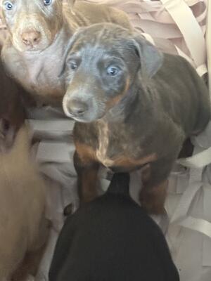Doberman puppies. One black and rust male. Two black and rust females. One blue and rust female. Two...