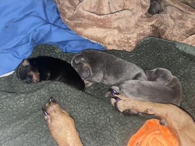 Doberman puppies born 5/19/25. Mom is a Blue American & dad is Black European. Puppies have had dewc...