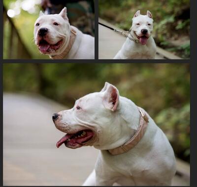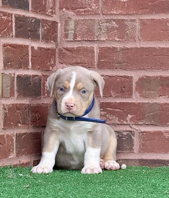 Her name is Elsa , she’s a Merle all white bully about 70lbs. Born Jan 15 2024. Two tone color blu...