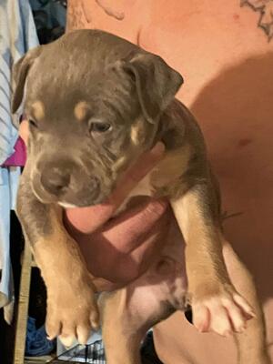 Blue tri color american bully with ghost markings a lilac Tricolor and a blue Tricolor female
