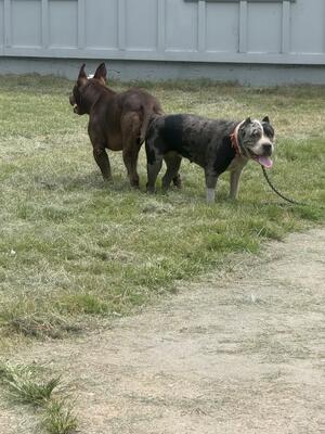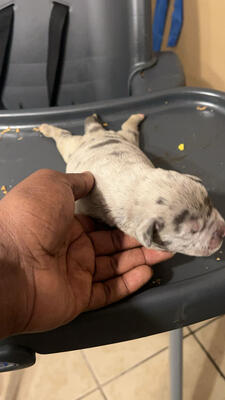 Mom is a chocolate Merle and the dad it a black bully. All black are 200 but they carry the Merle ge...