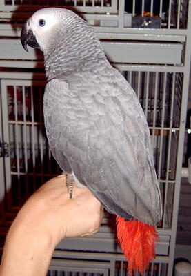 This African Grey is just under a year old. S/he likes to have his/her head scratched and likes to ...