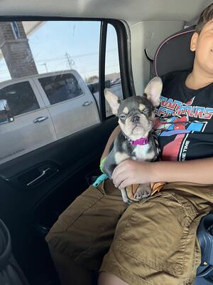 Blue and Tab French Bulldog female 6 months old Carrie’s cocoa fluffy cream pied she is AKC Regi...