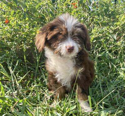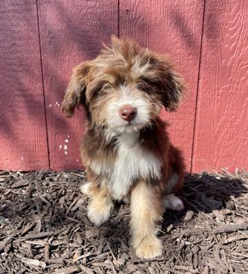 Male. Dad is mini bernedoodle and mom is American Shepherd. Expected weight is 25-30lbs. Well socia...