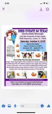 Coming this Saturday (October 4th), there will be a bird expo in Conroe where birds, cages, Volkman ...