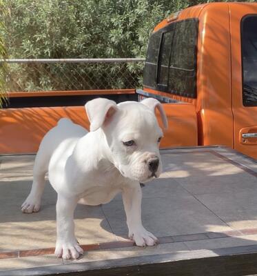 3-month-old pocket/micro American Bully male from Mad Max Γ Betty (stacked pedigree: Blue Face, Cho...