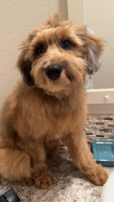 Female Red Merle Golden doodle puppy looking for her forever home. DOB: 12-16-24 Current on shot...