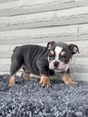 Meet Jack – our charming 12-week-old Blue and Tan English Bulldog puppy! Jack is playful curio...