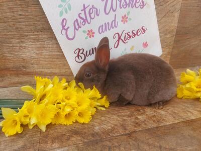 Looking for a great pet home for our blue eyed very handsome buck in broken chocolate color