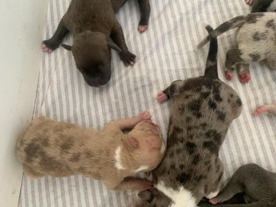 Merle American Bully puppies born 10/7, ready to go after Thanksgiving. Will be up to date on shots ...