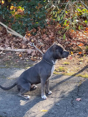 Beautiful, 3-year-old female American Pit Bull Terrier with papers. She’s a blue, tan, and white g...