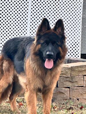 Male German Shepherd, 1.5 years old, long-haired, from Champion bloodline. Color: Black, Brown & Be...
