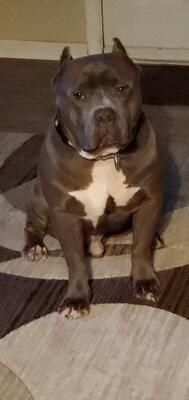 In need to rehome 7 year old American bully. Would be best as only pet home. Comes with all belongin...