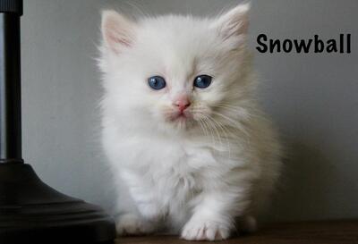 Snowball is ready for his new home. He is sweet and cuddly. He is white, with blue eyes, and long ha...