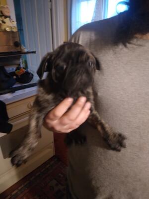 Pug mix puppies 10 wks 1 brindle male 1 dark reddish fawn male 2 fawn males vet checked 1st shots w...