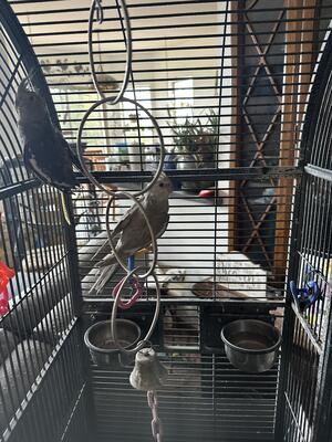 I have a large flight cage with lot of stuff to go with it. A pair of yellow up bishops and orange c...