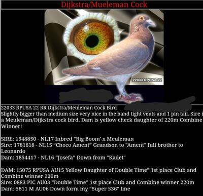 pedigree bloodline: mueleman, dijkstra, jansen, large or medium size. nice in the hand tight vents, ...