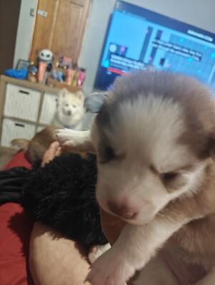 Stunning Chocolate & White F2 Female Pomsky! Ready Mid-June!