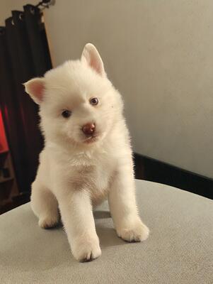 Meet "Lancelot" – Rare Solid White F2 Male Pomsky! 🐾 Lancelot is a breathtaking solid white F2...