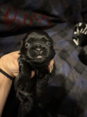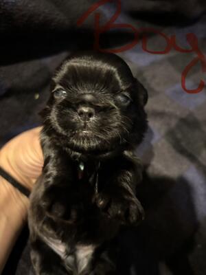 Male Shih Tzu. Solid black small white patch on chest. Will be vet checked, first set of vaccines an...