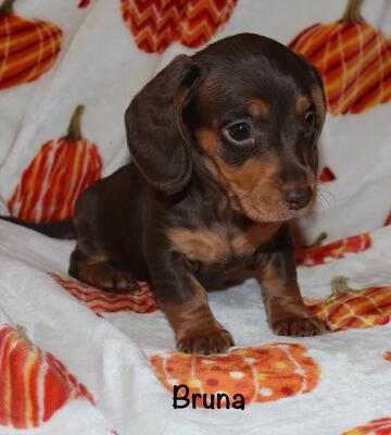 Bruna is a sweet chocolate and tan miniature dachshund puppy. She will be up on shots and. Dewormer ...