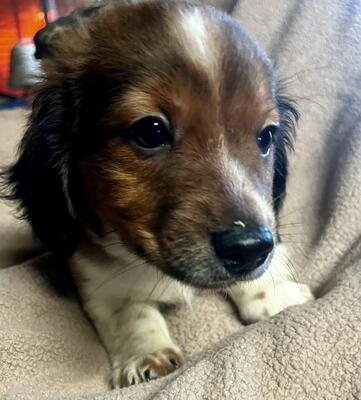 Candy is a female black and tan piebald miniature dachshund. Her parents are 9 and 11 lbs. she will ...