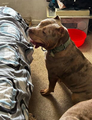 I have a 5 year old male pocket bully 2x Dax ghost tri..usbr register looking for a good home only b...