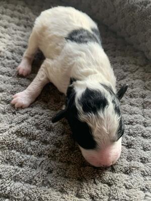 Female; black jacket/ white chest piece, carrying pied, testable chocolate, cocoa, blue & fluffy. S...