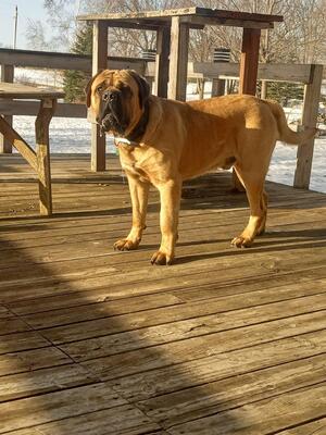 15 month old English Mastiff, AKC certified, great temperament outstanding build. Large head 190 lbs...